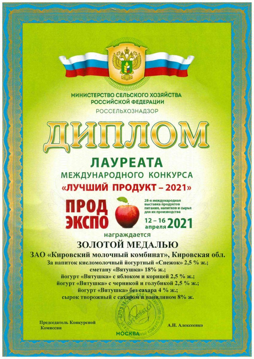 Сразу шесть продуктов Кировского молочного комбината (торговая марка «Вятушка») удостоены звания Лауреата и получили золотую медаль международного конкурса «Лучший продукт – 2021» в рамках 28-й Международной выставки продуктов питания, напитков и сырья для их производства «ПРОДЭКСПО – 2021». Конкурс проходил 12–16 апреля 2021 года ЦВК «Экспоцентр», г. МОСКВА.